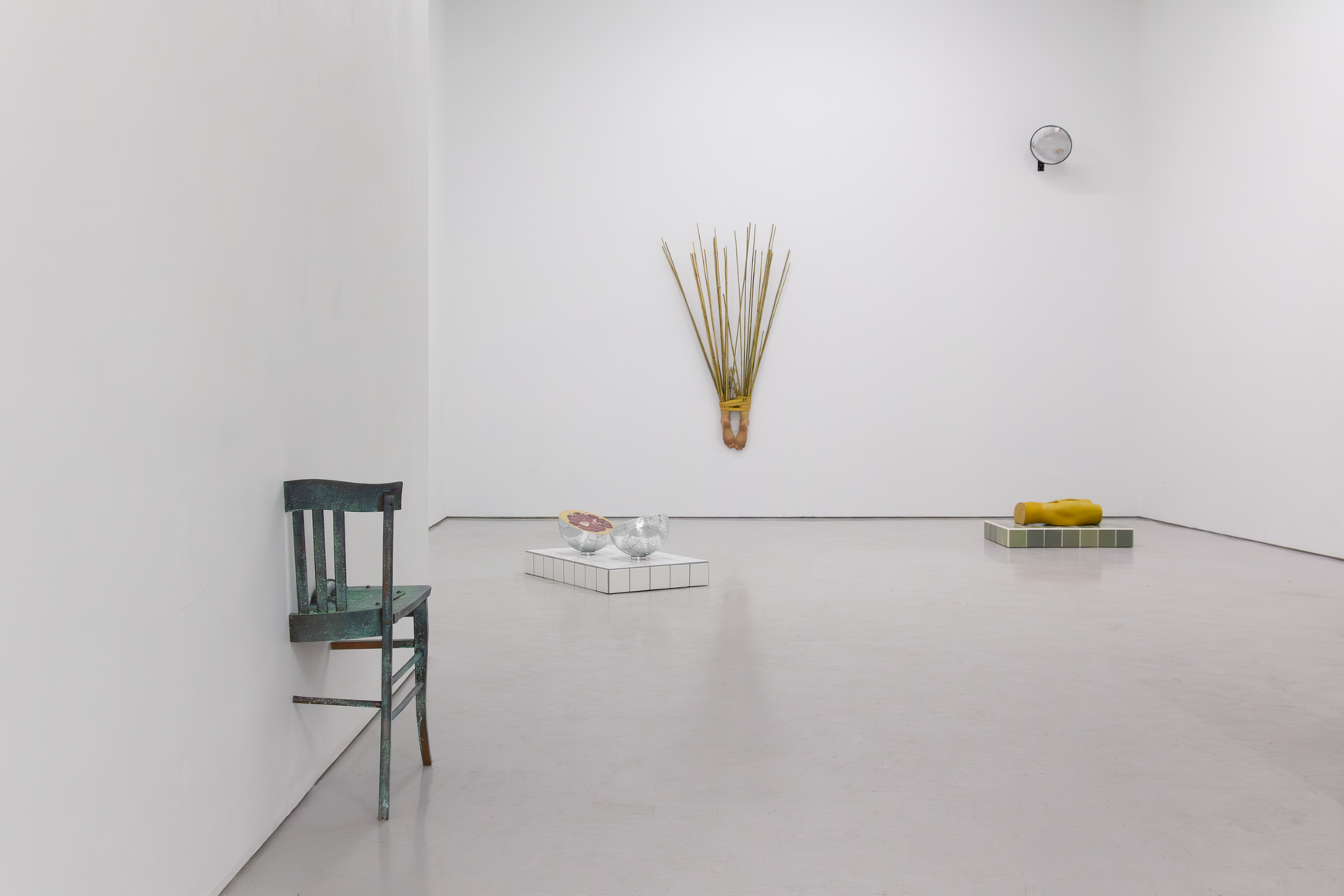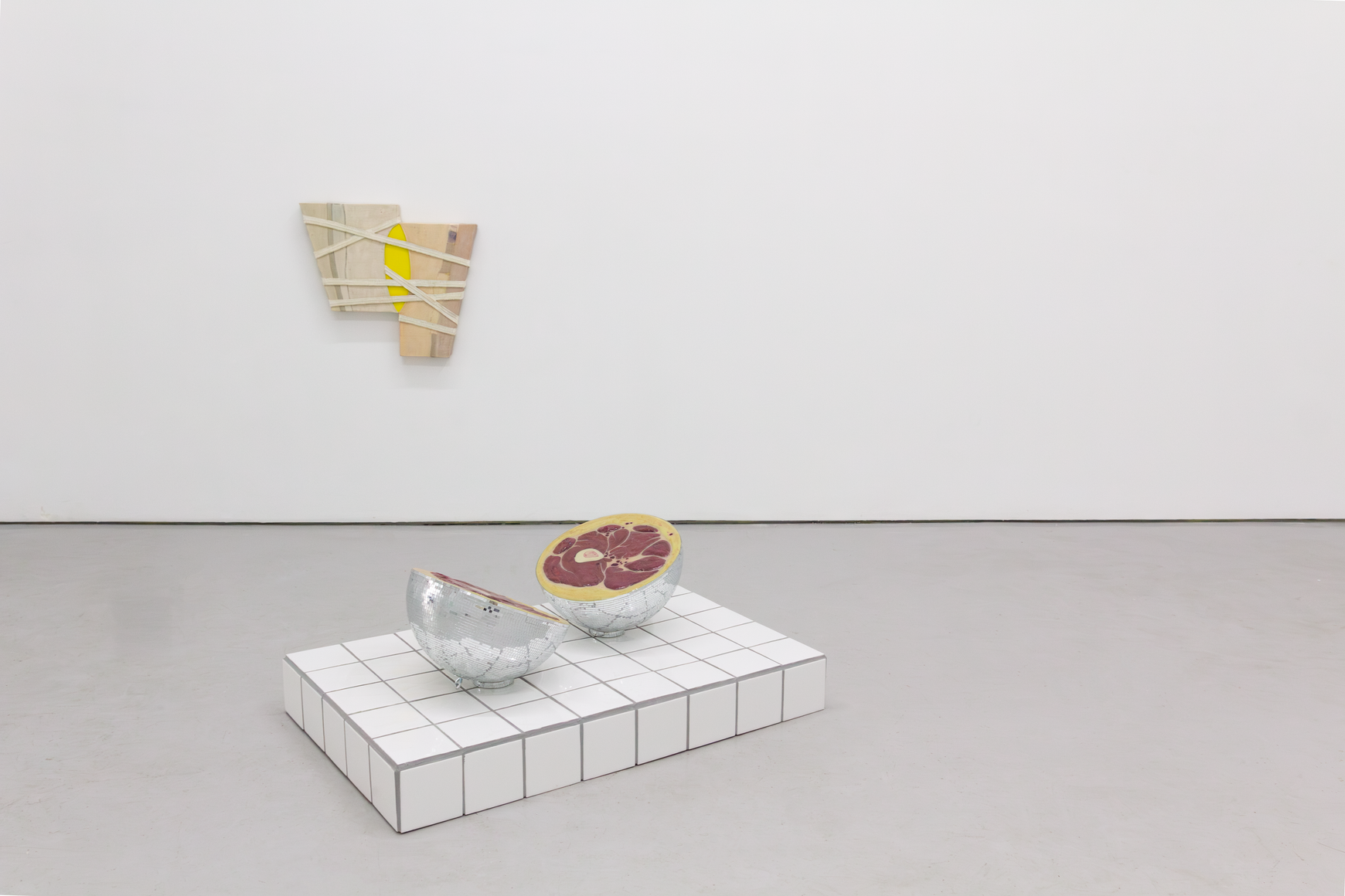 In Are You Still Strong Enough?, a reclaimed Wonder Horse toy was deified through the application of bronze patina. A sutured wound was meticulously sculpted down the abdomen of the animal, which is hung vertically. In this work, Alvarez-Backus finds a balance between gesturing as a means to alter and sculpting as a means to create. The decisive cut becomes metaphorical in I Was Softer Then, where a spliced disco ball reveals its interior anatomy to resemble the cross-section of a human thigh. If surgeons cut to mend what is supposed to be there, Alvarez-Backus’s wishful cutting instead reveals the tenderness of his subconscious. For Alvarez-Backus, exposure does not equate to legibility.