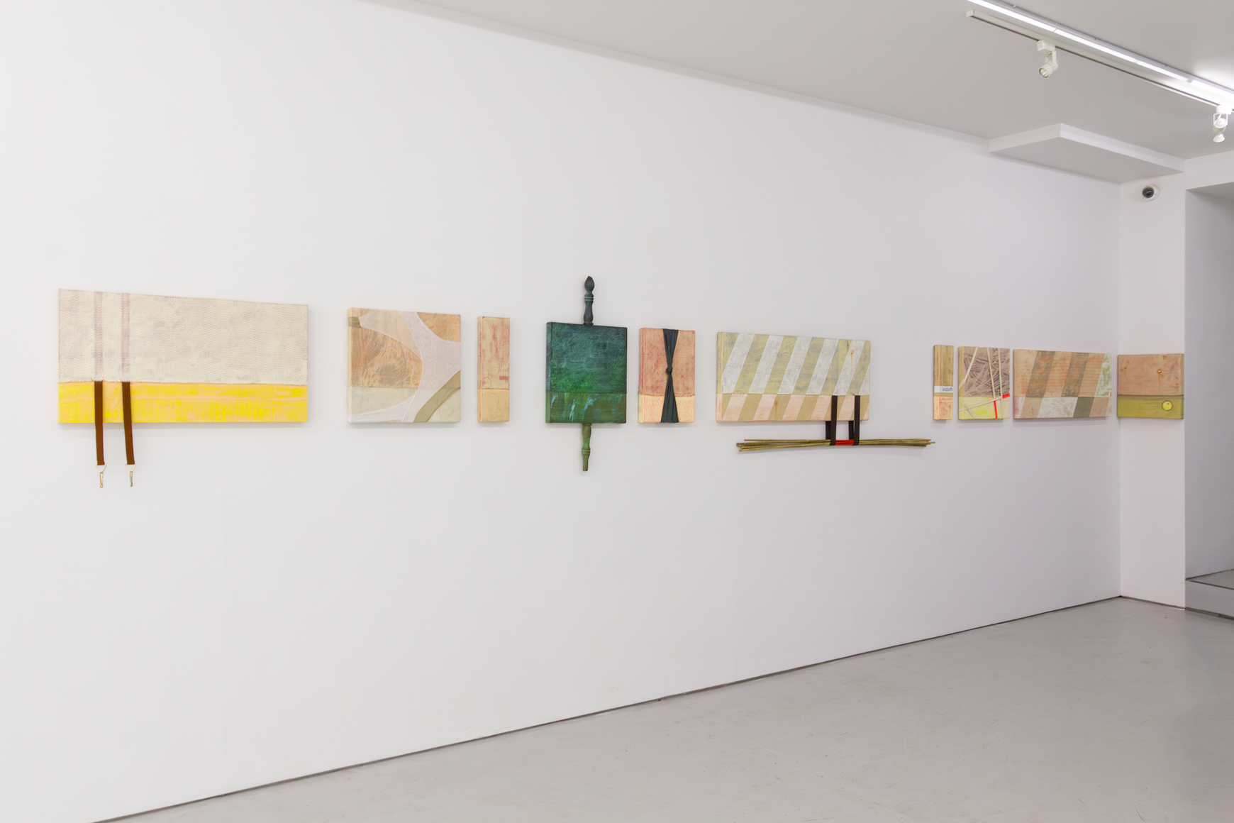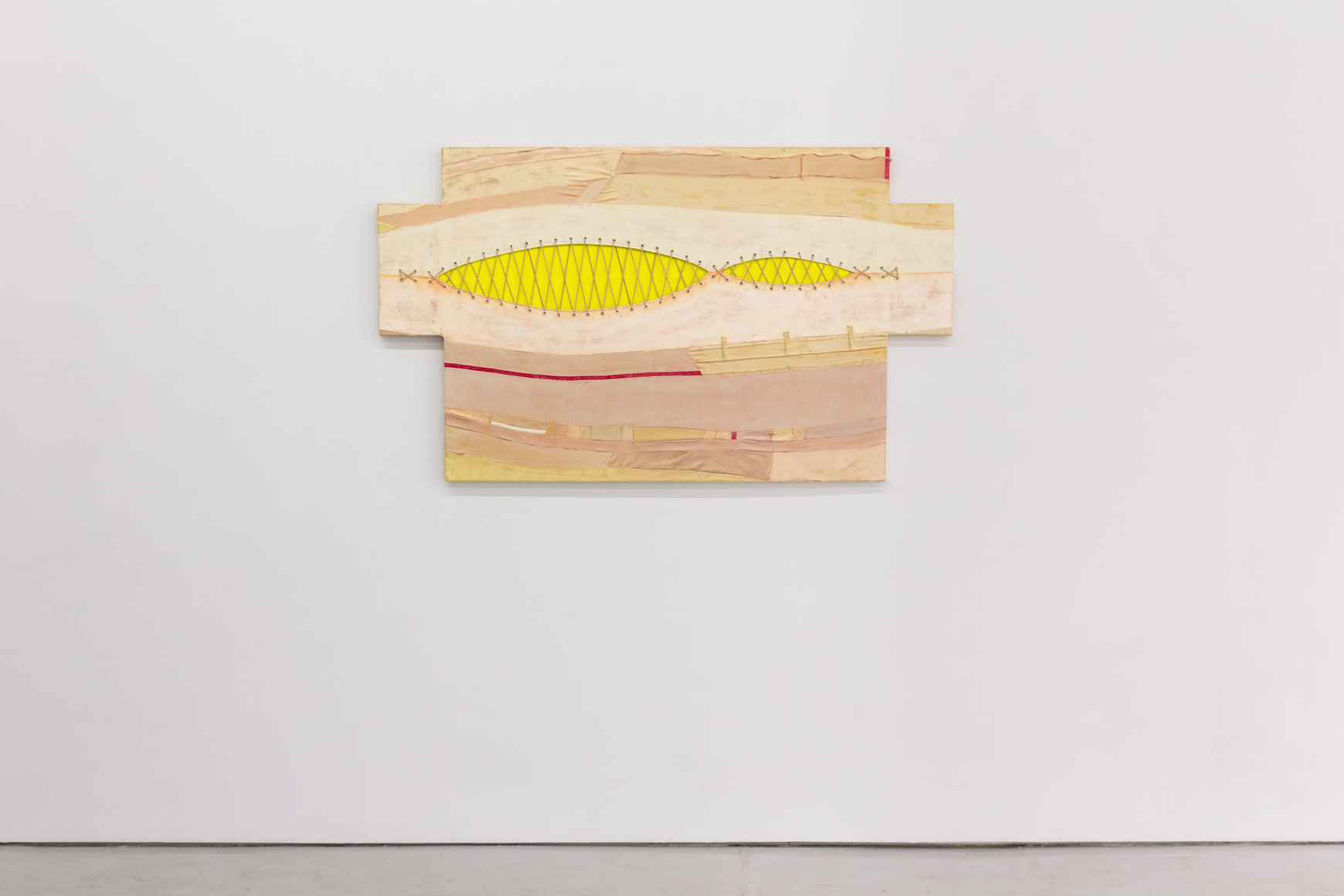 In the wall-based assemblages, reclaimed textiles act as surrogates for flesh and sources of comfort. They are stretched, torn, split apart, and held together at the seams, and in that tension reveal resilience and care. Many of these familiar forms undergo a process of slicing and splicing, which allows them to register both violence and trauma as well as the gradual progression toward healing and grafting. This duality becomes a material metaphor for rupture and repair. Installed consecutively over the long gallery wall, a series of ten flat works form a skin of sorts that is simultaneously connected and ruptured. Like individual cells sharing the same pedigree, these works, reminiscent of individuals performing collectively in a society, call for self-generation if one dares to split from their kind. Alvarez-Backus demonstrates a worldview of organic separation and re-organization, where rupture becomes a condition for kinship rather than its negation