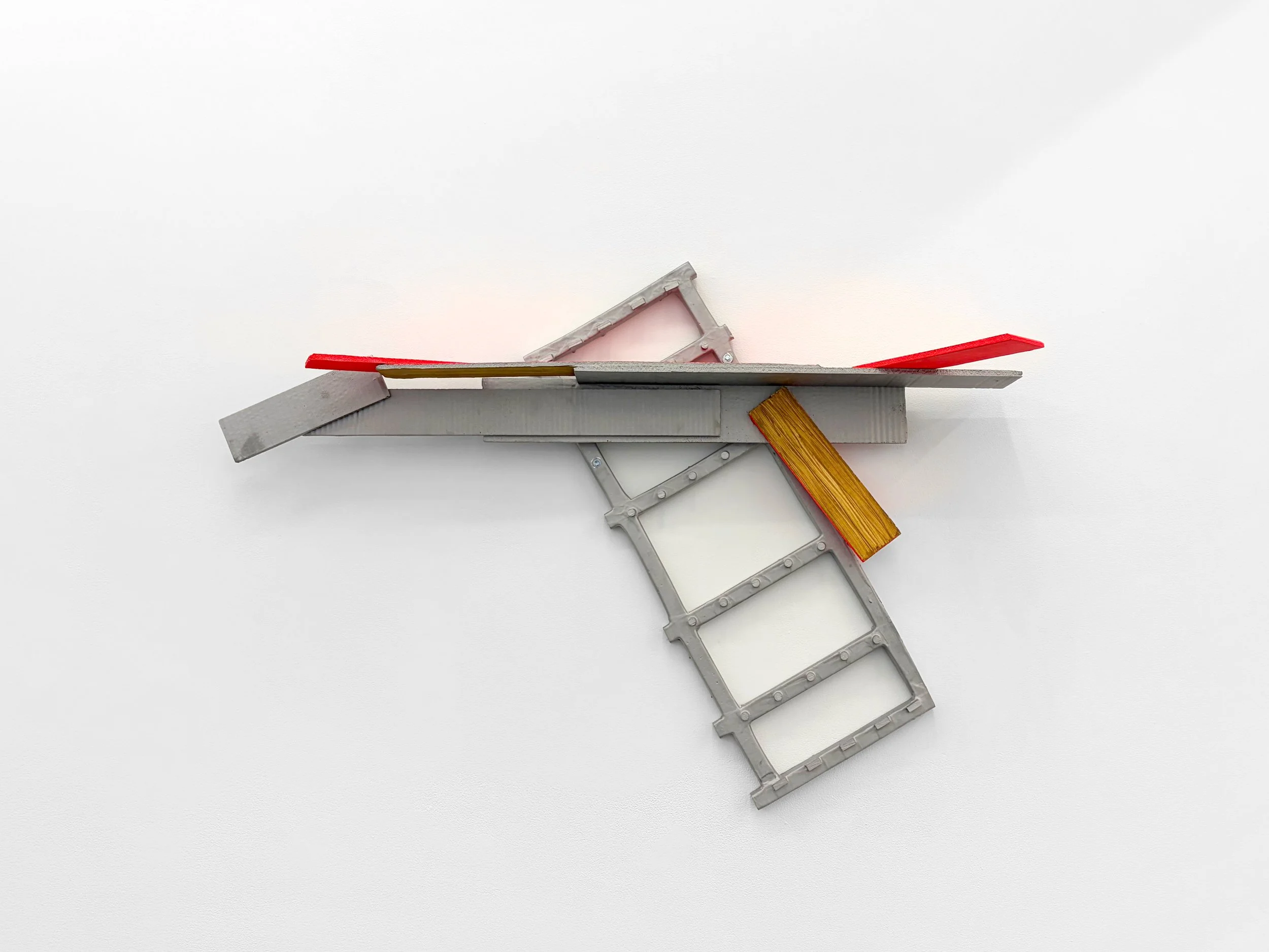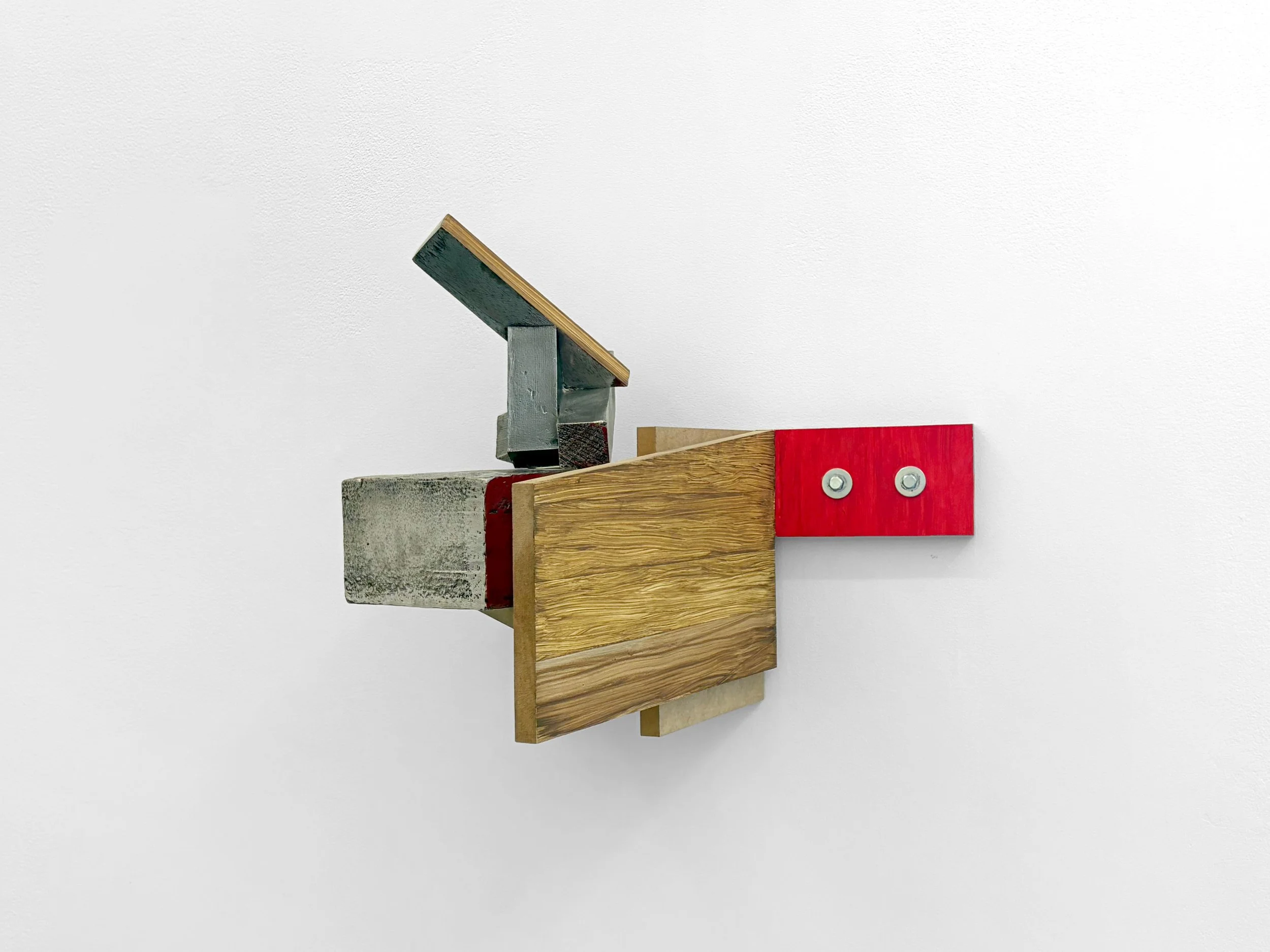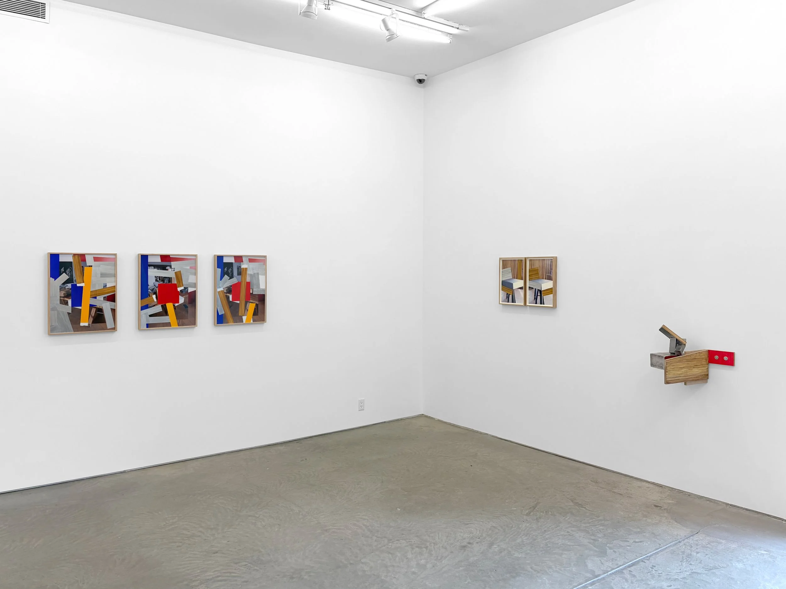 Accompanying the painted photographs are a new group of wall sculptures that further the process of disassembly by showing how form rises and falls based on point of view. The planar shapes that are layered, stacked and pressed together in these sculptures—painted in a way that mimics the same woodgrain, metal and plastic in the photographic images—disrupt the expectation of a flat surface that will function as a window to be looked through to where meaning will reside. Instead, Irazu redirects the gaze outward, back to the viewer and onto the shifting nature of the sculptures, showing them to be a composite of angles and textures that suggest the active development of a form rather than its final state. With their subtle architecture Irazu points to the capacity of each sculpture to function as a type of language unto itself, one with internal structure that still connects outward to the other works in the exhibition.