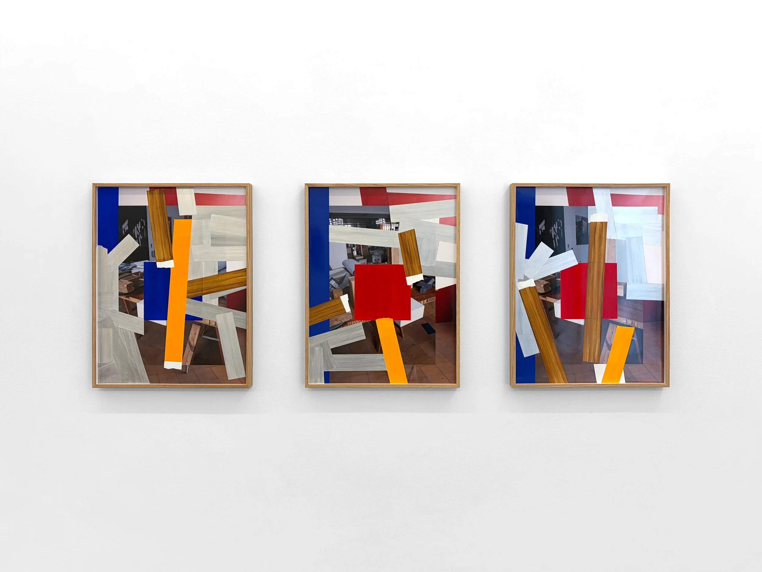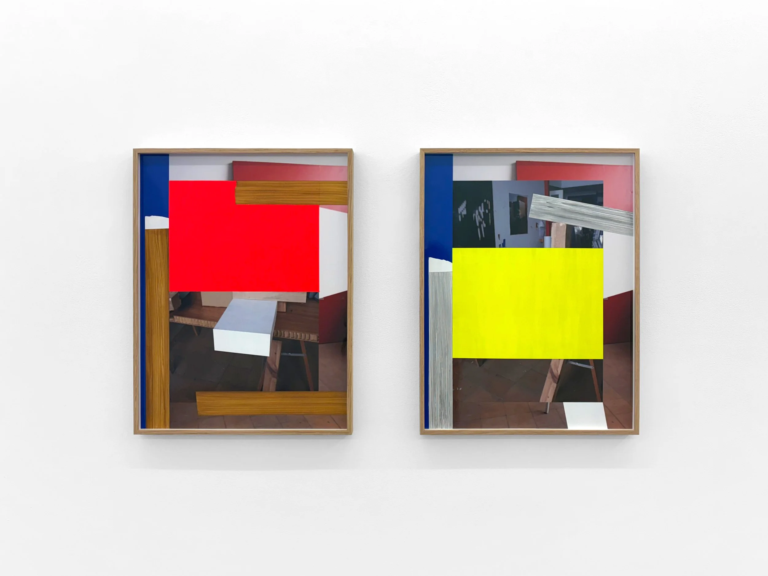 In Matter, Irazu questions whether an image is truly two-dimensional or if it can have mass and tactility that exists in the same space as the viewer. Whereas in earlier works Irazu’s painted photographs were adorned with mostly sparse, short and clipped strips of color, made to resemble tape or paper that had been affixed on top of the print, in the new works his disruption of the photograph with surface painting has been dramatically expanded. The images are constructed with a lattice of color and texture that alternately invokes woodgrain, metal and plastic, all intersecting and overlapping with one another. Hidden, obscured or buried beneath these areas of color are the studio scenes that Irazu photographed and which make up the underlying image. Though seemingly fractured beyond repair, what the compositions show is the way that images can take shape and reform, even under the most abstract of circumstances.