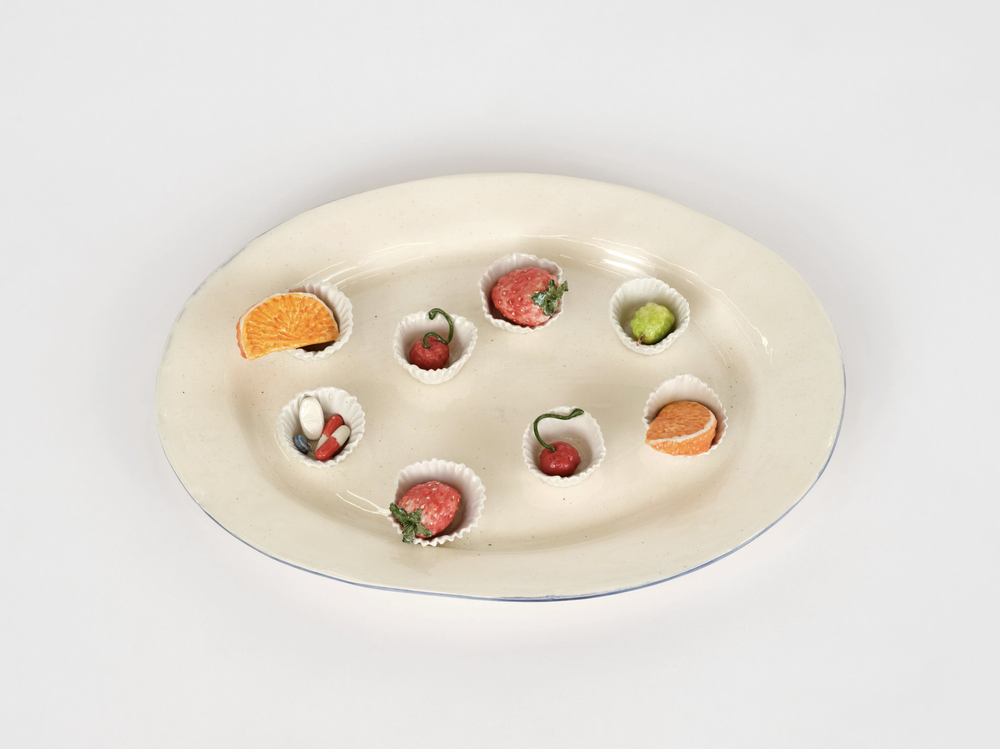 (Los Angeles, LA) Megan Mulrooney is pleased to present What Slips Beneath the Sugar, a solo exhibition by Alma Berrow. For the presentation, the traditional gallery layout is traded for a tablescape - a large oval table draped in a skirted tablecloth, embroidered in collaboration with Ellie Mac. The trompe l'oeil ceramics by Berrow gathered atop this table form an offering laid out for grazing and reflection. To either side, two ceramic "salad" wall sconces serve as candelabra, framing the scene. The gallery walls, painted a dusty 1970s orange, cast a warm glow over the room, transforming the "white cube" into an intimate dining room suspended in time - nostalgic, generous, and excessive.